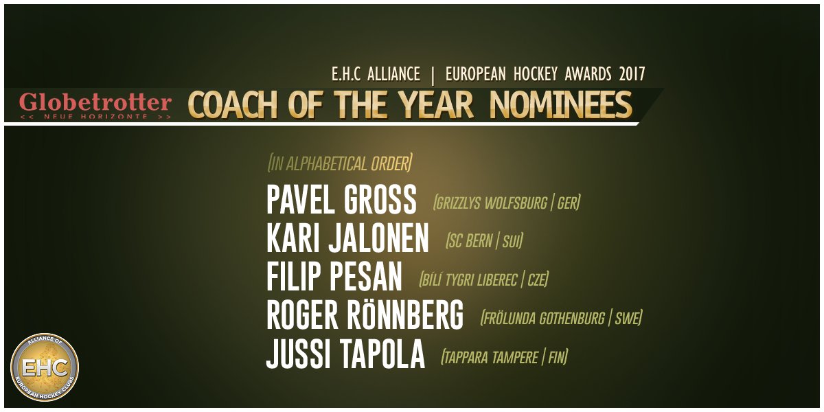 Jalonen johdatti Bernin Sveitsin liigan mestariksi. Tapola juhli puolestaan Tapparan kanssa jo toistamiseen SM-liigan voittoa.Muut ehdokkaat voittajaksi ovat Wolfsburgin Pavel Gross, Bili Tygri Liberecin Filip Pesan ja Frölundan Roger Rönnberg.