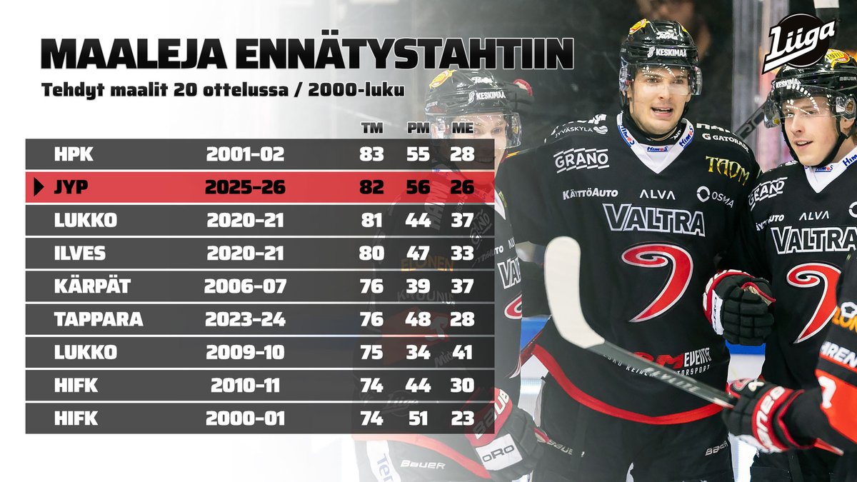 Yksi JYPin menestyksen tekijöistä on ollut joukkueen poikkeuksellinen maalitahti. Ensimmäisissä 20 ottelussa hurrikaanipaidat ovat iskeneet uskomattomat 82 maalia, eli 4,10 osumaa ottelua kohden.