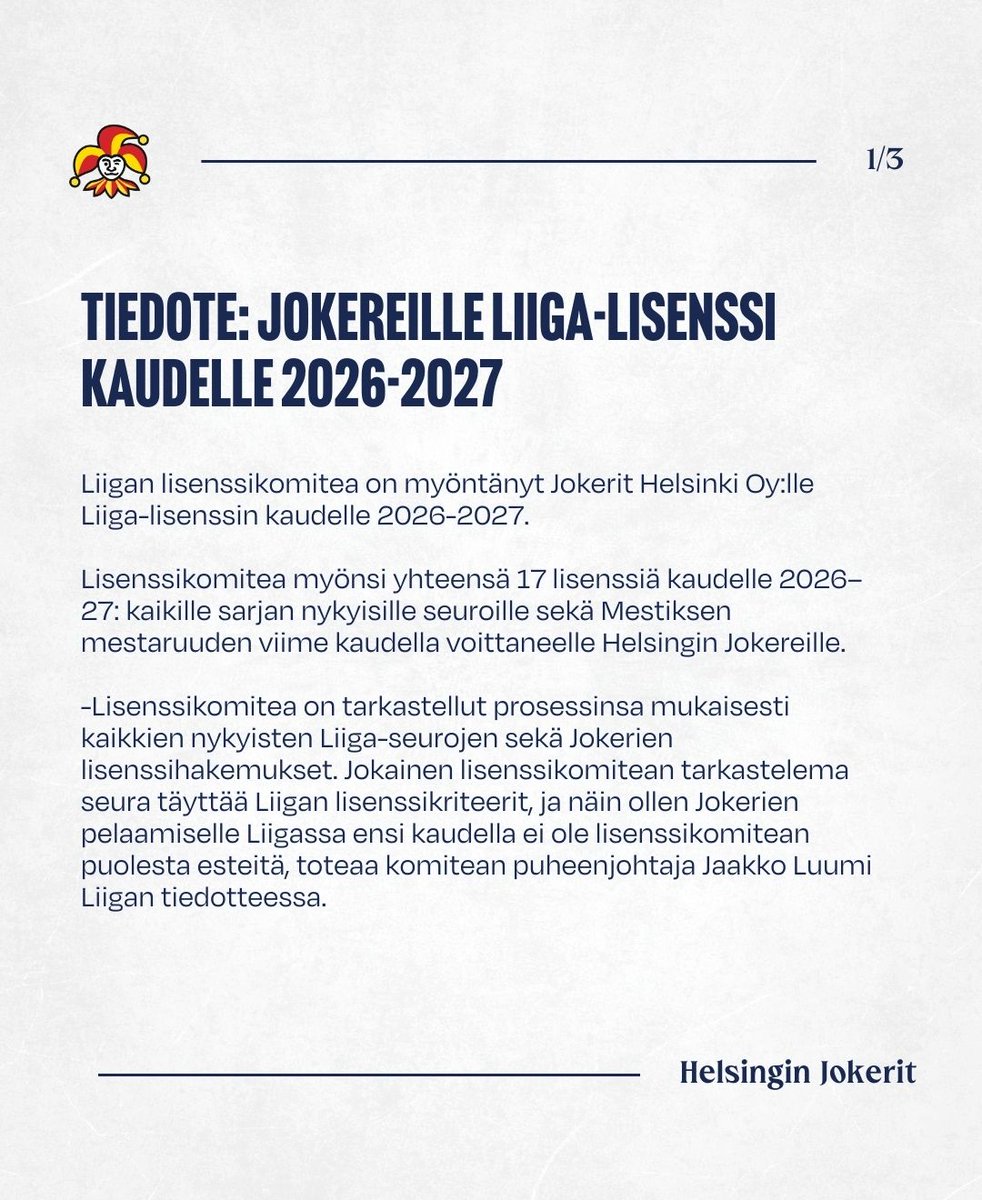 Helsingin Jokerit on saanut Liiga-lisenssin kaudelle 2026–2027.