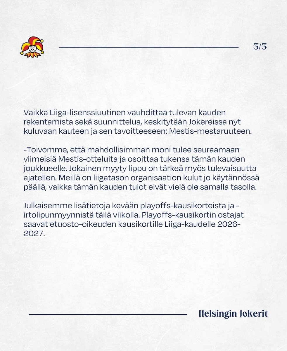 – Ennen kaikkea olemme tyytyväisiä koko Jokeri-yhteisön puolesta. On hienoa, että yhteisömme pääsee jälleen nauttimaan kotimaisen pääsarjatason jääkiekosta, jossa Jokerit ovat mukana, Saarni jatkaa.