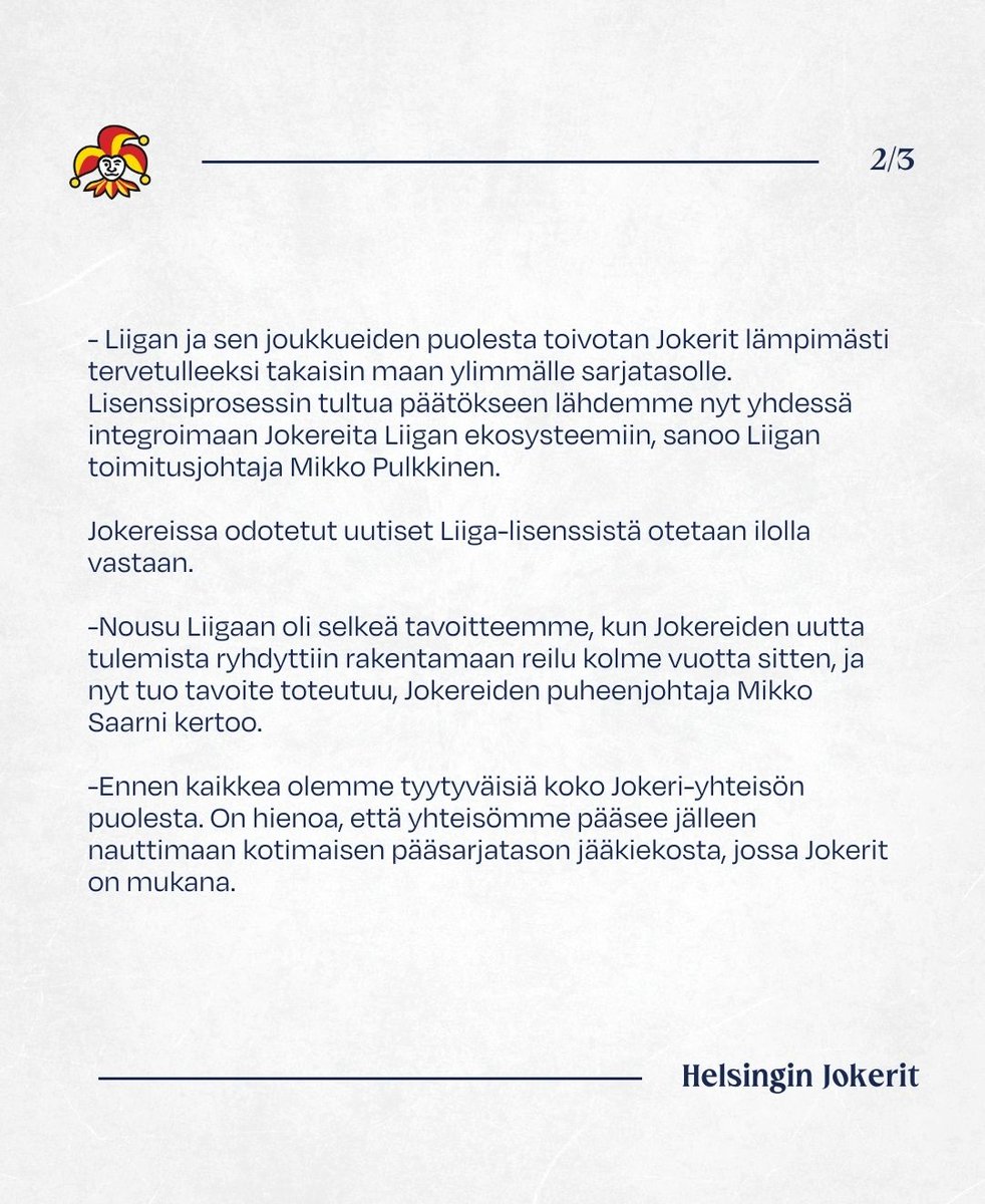 – Nousu Liigaan oli selkeä tavoitteemme, kun Jokereiden uutta tulemista ryhdyttiin rakentamaan reilu kolme vuotta sitten, ja nyt tuo tavoite toteutuu, Jokereiden puheenjohtaja Mikko Saarni kertoo seuran tiedotteessa.