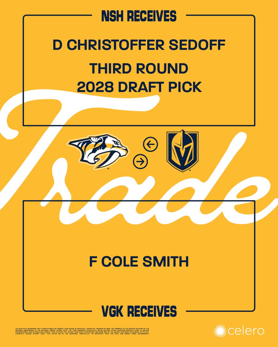 We've acquired defenseman Christoffer Sedoff and a third-round draft pick in 2028 from Vegas in exchange for forward Cole Smith.